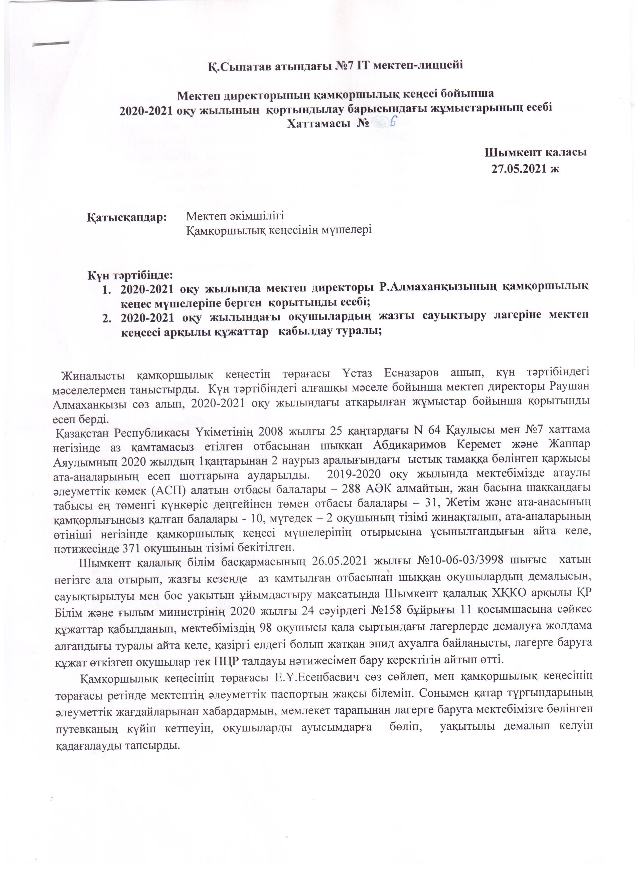 ҚАМҚОРШЫЛЫҚ КЕҢЕСІНІҢ ХАТТАМАСЫ » Қ.Сыпатаев атындағы №7 IT мектеп-лицейі
