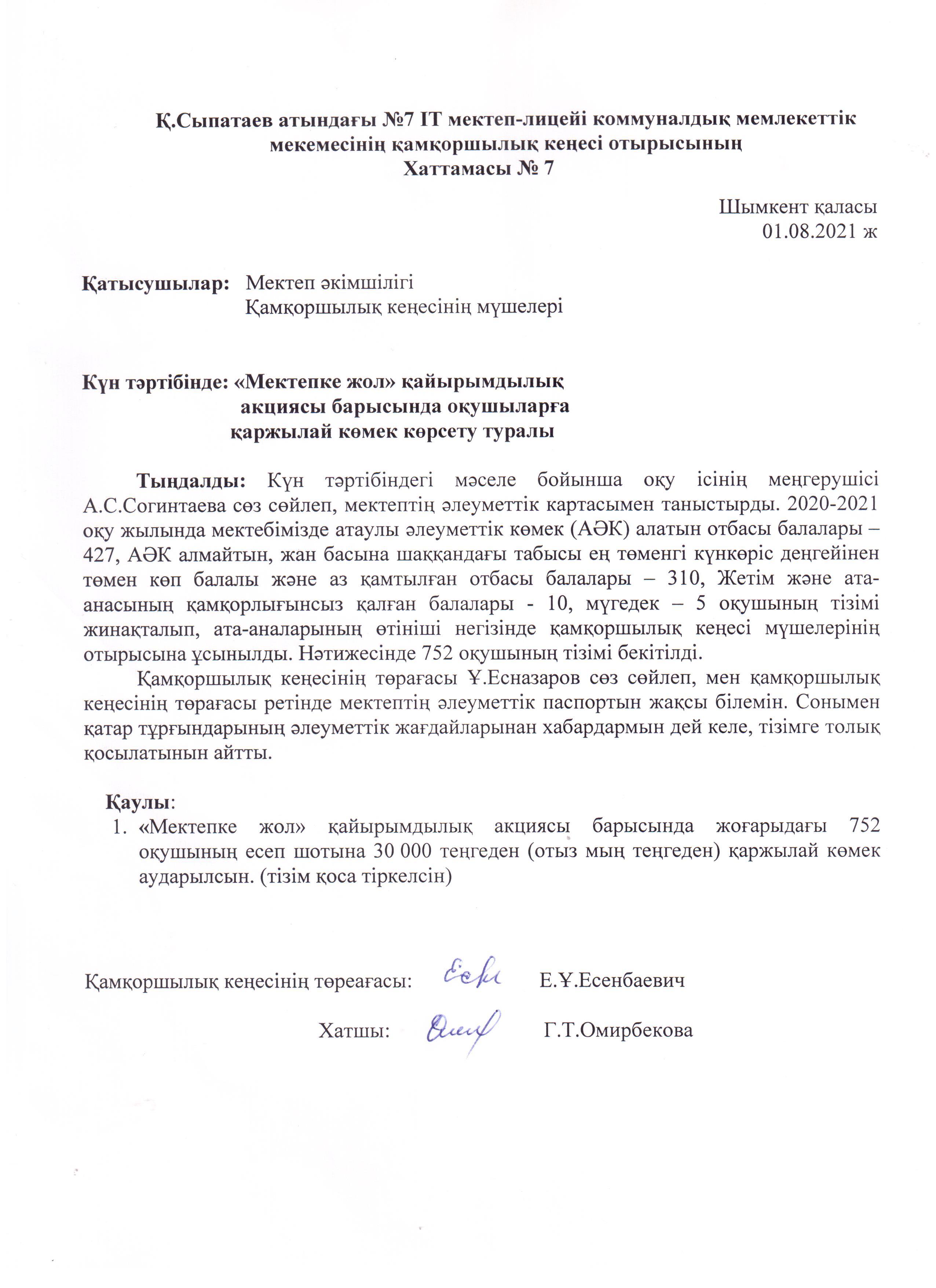 ҚАМҚОРШЫЛЫҚ КЕҢЕСІНІҢ ХАТТАМАСЫ » Қ.Сыпатаев атындағы №7 IT мектеп-лицейі